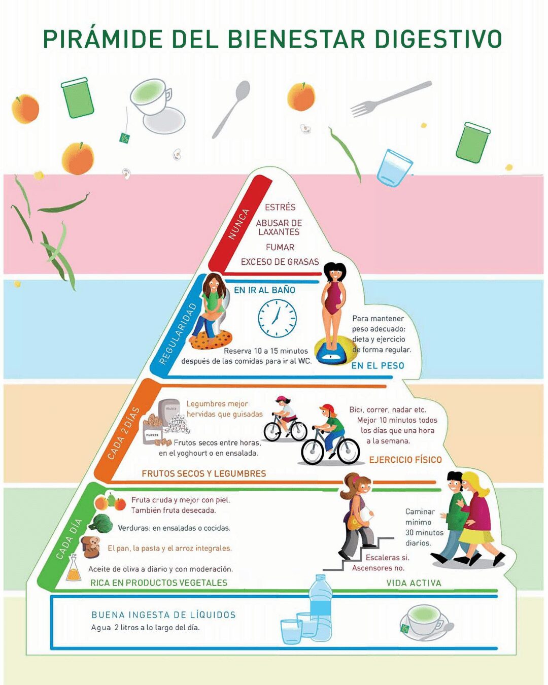 La Pirámide del bienestar digestivo resume de forma visual los principales hábitos que favorecen una buena salud digestiva. Mantener una alimentación equilibrada, rica en productos vegetales, asegurar una adecuada ingesta de líquidos, practicar ejercicio físico regular y cuidar la regularidad intestinal son pilares fundamentales para el bienestar digestivo.