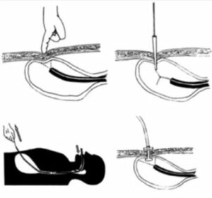 A continuación, se realiza una incisión de aproximadamente 1 cm y se introduce una aguja hueca (trócar) hasta alcanzar el interior del estómago. A través del trócar se pasa un alambre guía que se sujeta con el endoscopio mediante una pinza. Al retirar el endoscopio, el alambre se arrastra hasta la boca del paciente. En ese momento, la sonda se fija al alambre guía y, traccionando de él, se introduce la sonda por la boca hasta hacerla salir por la incisión abdominal, donde queda asegurada mediante un sistema de fijación relativamente rígido.